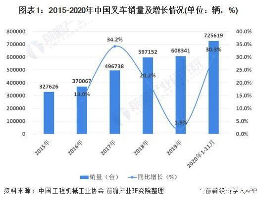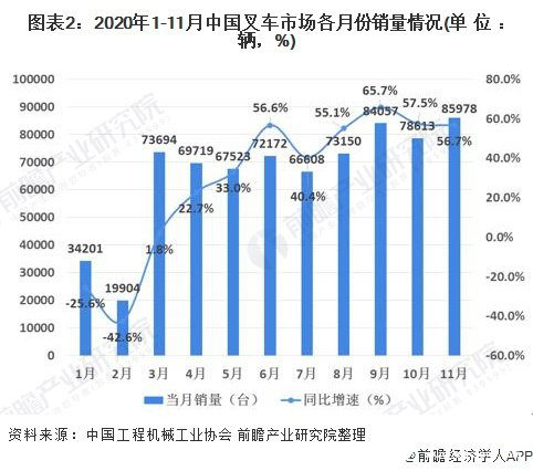 2020年受益于國內新冠疫情得到迅速控制,國內制造業、物流業的快速恢復,叉車市場需求快速增長。2020年1-11月份的累計銷量達到72.56萬輛,與2019年同期相比增長30.3%。