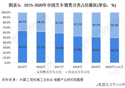 從2015-2020年中國叉車銷售分類占比情況來看,電動式叉車的銷量占比逐年提升,從2015年的36.7%提升至2020年1-11月份的50.3%。主要是受到環保政策及室內作業環境要求的驅動作用,電動叉車需求持續增長。另外,根據中國工程機械工業協會資料顯示,在發達國家的叉車銷售結構中電動叉車占比均超60%,未來我國電動叉車比例將持續提升,叉車電池比例也會同步提升。